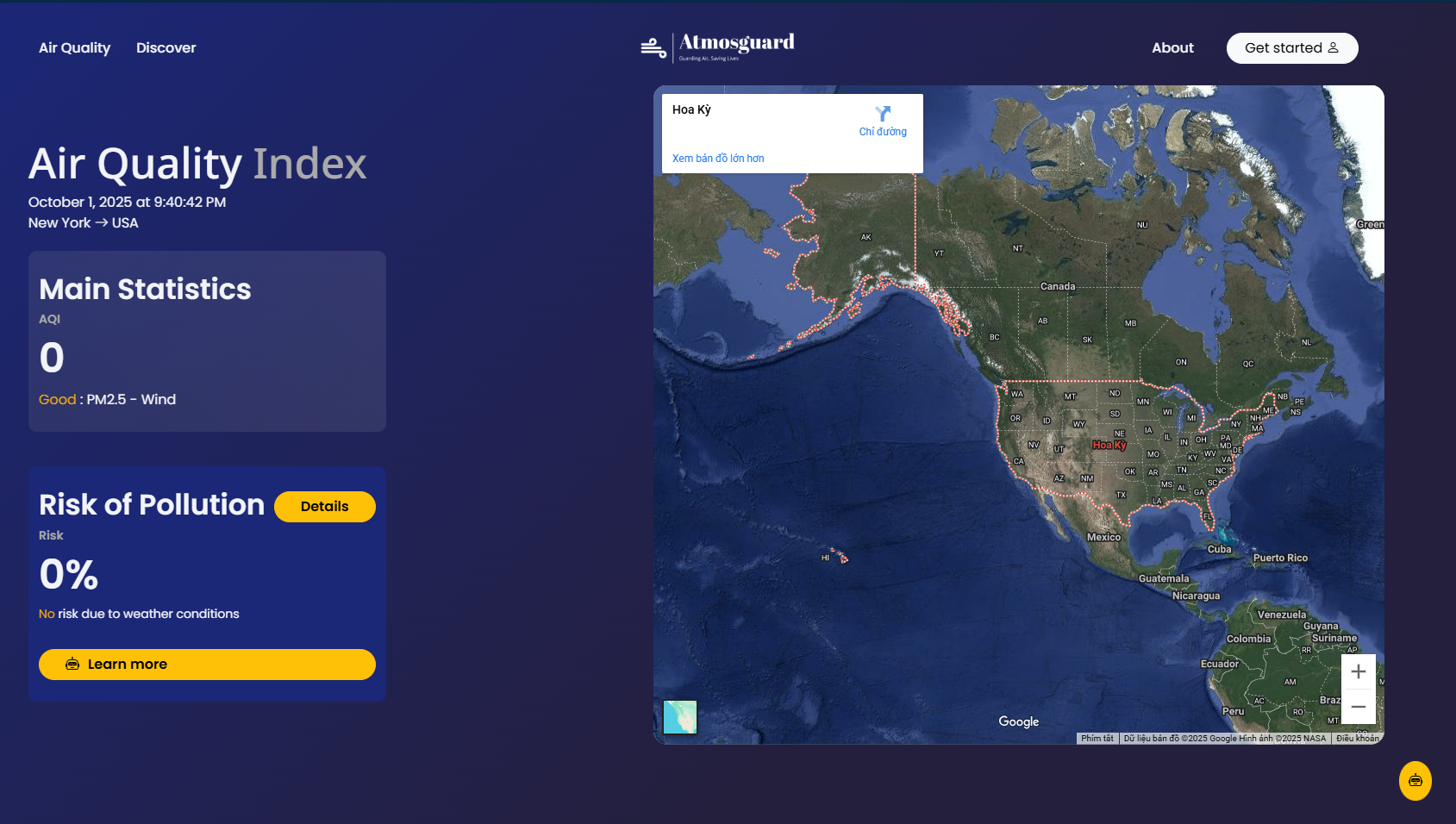 AtmosGuard provides up-to-the-minute data on air quality across U.S. cities. Users can see the current Air Quality Index (AQI) and understand whether the air is safe to breathe, with pollutants like PM2.5 clearly identified.